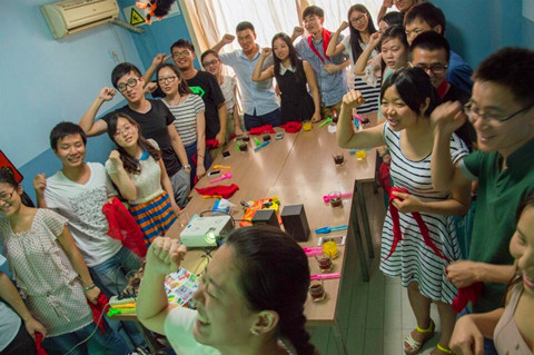![]() 在每一场游戏中,输的一组需要派代表抽取惩罚卡,说是惩罚,其实是为大家提供了又一个表现的机会,有惟妙惟肖模仿“林志玲”声音者,有声情并茂上演“山无棱,天地合”对白者,有傻傻大笑者,这一刻房间里只有欢乐的笑声。