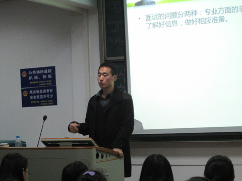 尹俊杰从自我定位、简历制作与投递、笔试、面试、签约等多方面进行了讲解。通过对几封简历的分析,他提醒我们要注意简历的精炼,最好不要超过一页;同时注重工作经验实习经历等。在面试环节,他指出这是考察英语综合能力和仪态谈吐等多方面,一定要充满自信,把自己最好的一面展示出来。