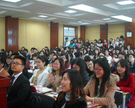 讲座伊始,林教授幽默风趣、通俗易懂的话语就博得同学们的阵阵掌声。林教授首先把自己的求学经历给大家娓娓道来,其中“穷得连乌鸦都会哭着飞走”“一切听从党的安排”“世界上最孤独凄凉的事情是一个老男人在卫生间里独自染头发”等话语让同学们笑得前俯后仰。林教授善于用自嘲的方式来解释他至今取得的辉煌成就,让大家看到了作为一名真正的翻译家所具备的谦虚大度的品质,令在场的师生们为之钦佩。林教授从自己的经历中总结出两条经验:想要做好翻译,第一必须要了解文学,要有良好的写作能力;第二是要大量阅读,从小多看书。在这里,他还特别强调,学习外语但是绝对不能丧失母语写作能力。林教授丰富的个人经历让同学们受益匪浅。