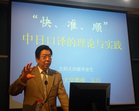 3月22日上午,日本大学华籍教授吴川应邀到我院3408教室为日语系同学作了一场题为“谈中日口译三原则——快、准、顺”的专题讲座。讲座由我院副院长、日语系主任李俄宪教授主持,日语系全体教师也一并出席了本次讲座。