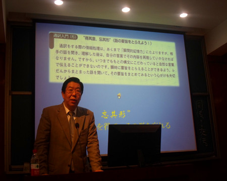李俄宪教授开场介绍道,吴川教授毕业于北京师范大学,现于日本大学研究生院和国际关系OD网页版担任教授,并发表了众多关于中日语言方面的著作。此外,吴川教授也曾在日本电视节目《中文讲座》中担任主持人,主要讲关于翻译原则的应用篇。今天,他便将他所录制的13次节目的录音资源与大家一起分享。 过程中,吴教授特别强调了同学们在日常翻译中的一些误区,并带领同学们学习掌握口译的方法。他说道,其实同声传译并不像传说中那样神奇、准确,由于时间限制,翻译的精度一般会降低,最高也只能达到60%的精准度。因此,在同声传译的时候,一定要做到口耳分开。老师形象地比喻说,这就像初弹钢琴时两只手不能协调一样,但是只要多加训练,就能达到熟能生巧的境地。