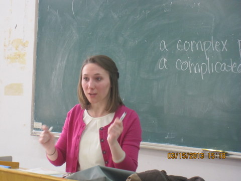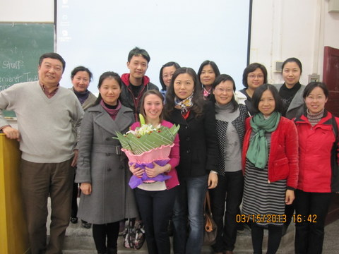 教学研讨活动的第一个环节是观摩Lauren Savo的读写公开课。Lauren Savo老师来自美国马里兰洛约拉OD网页版(Loyola University, Maryland),2012年8月起在公共外语系任教。 Lauren老师本次教学内容为大学英语读写译第四册第一单元。上课之前,Lauren老师首先介绍了与即将到来的美国节日St. Patrick’s Day(3月17日)有关的风俗习惯,巧妙地将学生带入了轻松的英语学习氛围。在接下来一个半小时的时间里,Lauren老师先是细致深入地讲解了本单元所涉及的重点词汇,结合美国生活实际分析了相关单词和语法在当代美国的用法,接着她带领全体同学对课文内容进行了宏观把握,突出讲解了课文中的重难点。在整个授课过程中,Lauren老师清晰响亮的语音,严谨活泼互动的教学风格,联系实际的精准讲解,深深地吸引了全班六十余名学生,也感染了所有到场的老师。下课时,在场的师生对Lauren老师精彩的讲课报以热烈持久的掌声。