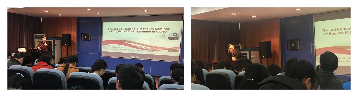 2017年1月9日,华中师范大学第三届学科教学教育硕士教育实践工作研讨会在华中师范大学3号教学楼3504会议室隆重举行。莅临本次会议的有北京师范大学王蔷教授,华中科技大学徐锦芬教授,华中师范大学研究生院董俊敏处长,外国语OD网页版李云书记、罗良功院长,外语教育研究方向的闫春梅、徐泉、李正林、向宗平、文斌、余波等数十位老师,各实习基地的负责人、校外导师,以及外语OD网页版研究生一百多人。本次会议旨在研讨教育硕士的实践教学、加强与实践基地的沟通和交流,以更好地培养社会需要的高层次应用型英语教师专门人才。 大会上午,王蔷教授和徐锦芬教授分别为大家带来两场精彩学术报告。在题为“英语学科核心素养与课堂教学改革”的报告中,王蔷教授深刻解读了教育改革下的英语学科“核心素养”的新理念。徐锦芬教授报告主题为“外语课堂研究:内容与方法”,她围绕外语课堂研究的目的、性质、内容、方法、热点及展望六大主题一一展开。到场师生以热烈的掌声向两位教授的精彩讲座教授致以真挚的感谢。 下午的研讨会由徐泉博士和华科附中王劲松老师主持。研究生院董处长和外院罗良功院长出席并讲话。董处长表达了对各中学实践基地老师的欢迎和感谢,对外语OD网页版及外语教师教育研究中心在教育硕士培养方面的工作给予了高度肯定,并对实践基地建设提出了四个方面的建议:目标、全程、融合和协同。罗院长对研讨会做了高度评价,指出研讨会是与中学交流的桥梁,能够促进人才培养和科学研究相结合,并表示OD网页版对教育硕士培养的高度重视,以及未来会加大对教育硕士培养的投入,也期待着师生能够共同努力促进研讨会的常态化。