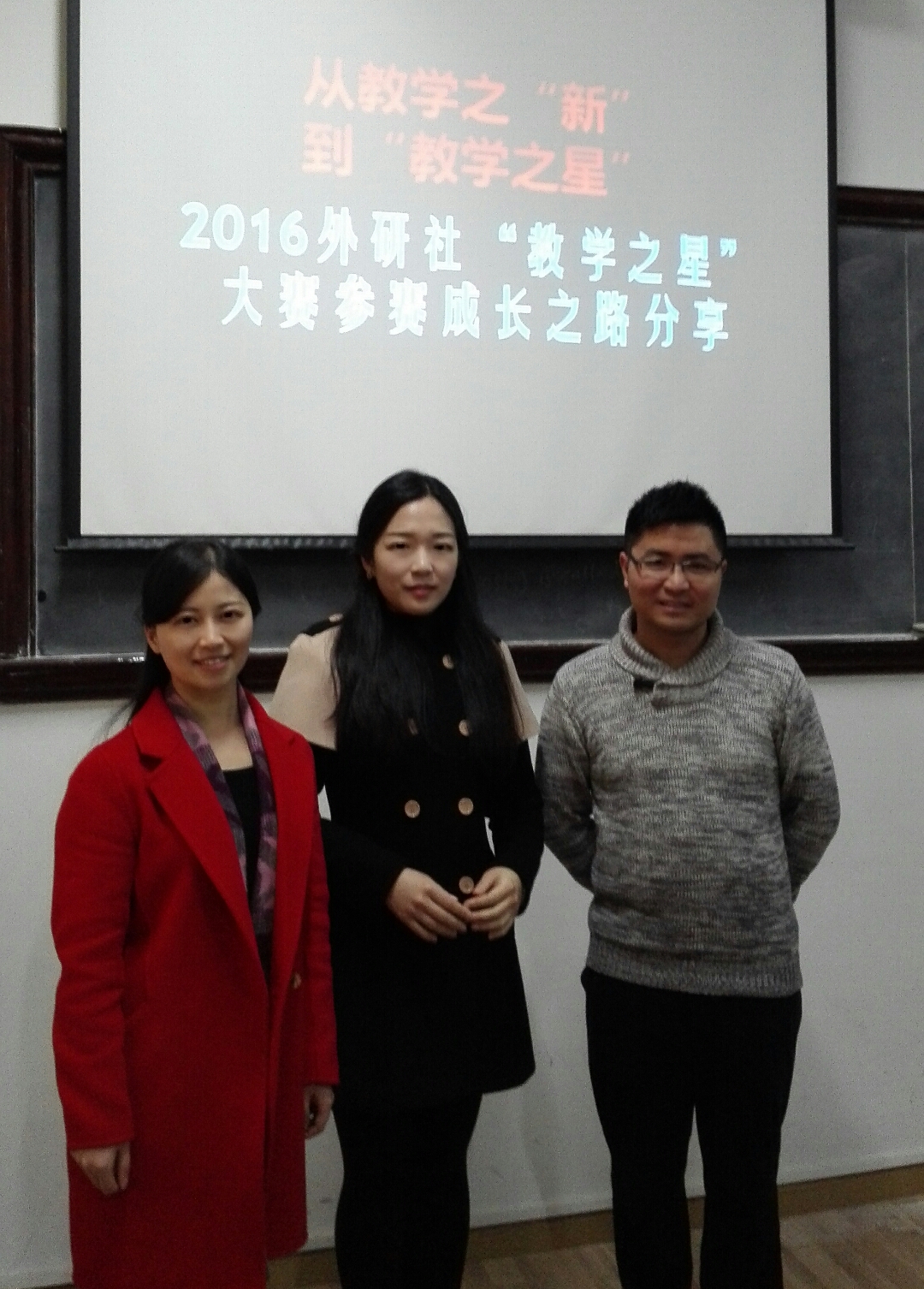 3月24日上午10:00大学英语教学研究中心在3318教室举行2017年春季沙龙“从教学之新到教学之星”。刘文波、李珺和王建洋三位老师分享了他们的备赛参赛历程、经验及心得。 刘文波老师获得第七届“外教社杯”全国高校外语教学大赛视听说组全国特等奖。她介绍了大赛的赛程和赛制,自己的参赛历程和感悟。内容涵盖了授课说课评分标准、课程设计考察的各个项目(教学理论、教学内容、教学设计和综合素质等),阅读教学理论书籍及文献,利用视频素材进行授课说课设计(素材分析、主题挖掘、教学设计、语言特点、内容结构、主题思想、切实结合教学素材进行分析与教学设计)等。 李珺老师获得第七届“外教社杯”全国高校外语教学大赛综合组全国三等奖。她介绍了大赛的赛程安排和比赛规则,录像授课评分标准及权重(教学内容、教学过程、教学效果和综合素质),从选材、思路、团队、着装等方面讲述了自己的录像授课准备心得,回答问题的评分标准及权重,以及说课准备心得等(包括框架、文体练习、文化背景知识、课堂活动设计等)。 王建洋老师获得2016年外研社“教学之星”大赛全国亚军。他从参赛的心路历程和微课的制作两方面向大家介绍了参赛的整个过程。自我成长,家人的鼓励和支持是激励他参赛的原因。在竞赛过程中,他学习了微课及翻转课堂理念。在介绍了选定的微课主体、设计微课PPT以及制作微课视频的基础上,他对整个参赛过程进行了反思,总结了大赛的收获,最后详细介绍了微课制作的整个过程。