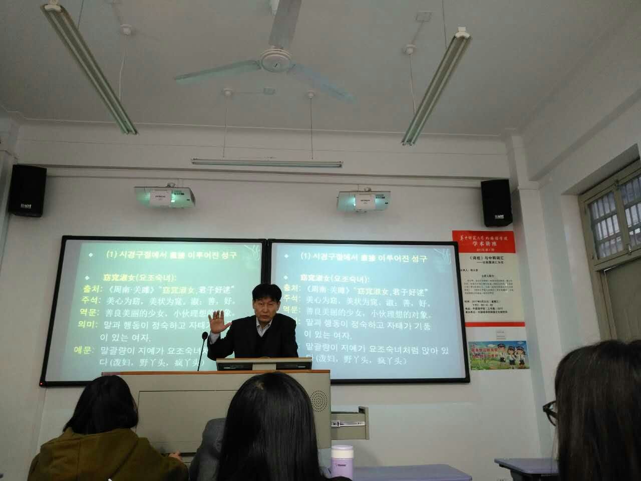 2017年3月22日,延边大学朝鲜-韩国学OD网页版,博士生导师郑日男教授,在华中师范大学外国语OD网页版3402教室,为韩语系的师生进行了时长两个小时的以“《诗经》与中韩词汇”为主题的讲座。此次讲座由华中师范大学韩语系承办,旨在强化跨学校间韩语文化的学术交流,促进师生进一步深化对韩语、韩国文化的学习研究。
