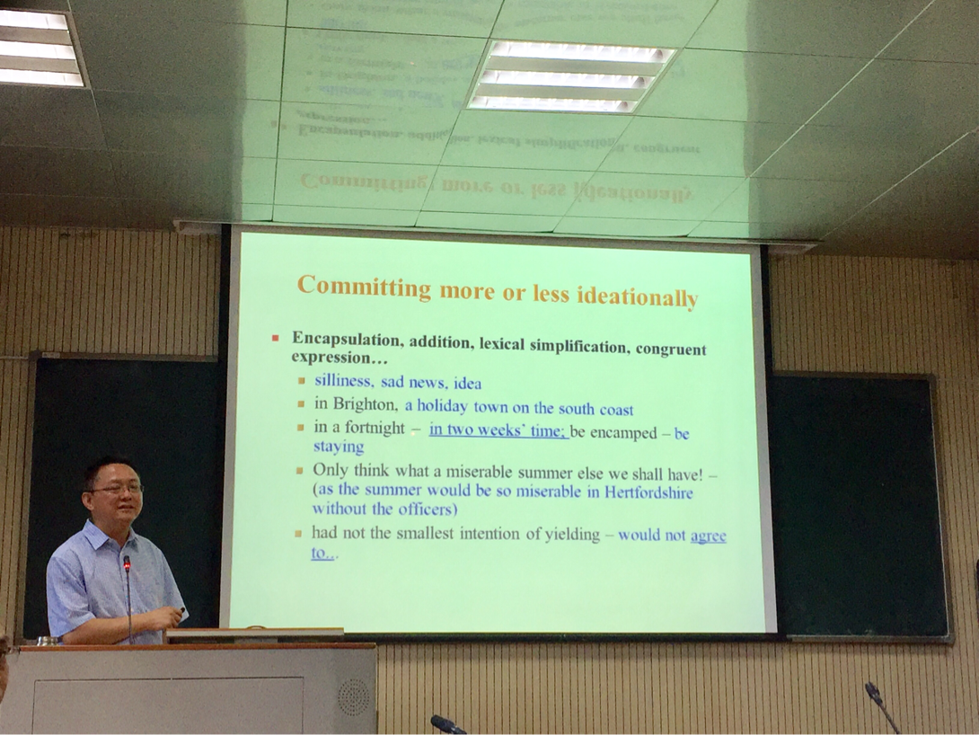 常晨光教授是中山大学外国语与翻译大OD网页版副院长,博士生导师。主要研究方向为功能语言学、应用语言学、澳大利亚研究。近年来发表外语教学研究、词典编纂、功能语言学与语篇分析等方面的论文30余篇。编著、译著10余部。 常晨光教授的讲授主要介绍从系统功能语言学的角度研究翻译,强调翻译过程中原文和译文在同一语境中要注重功能的对等,同时强调了翻译的“再实例化”(Re-instantiation),从Coupling和Commitment两个角度进行分析,并以《傲慢与偏见》为例,从人际意义、概念意义和语篇意义对原文译文进行了对比分析。 讲座结束后,常教授对师生们提出的问题,耐心地进行了解答。最后王勇教授对常教授的讲座作了精彩点评。讲座为我院师生提供了一种不同于传统的、基于功能语言学视角和方法进行翻译研究,大家收获颇多。