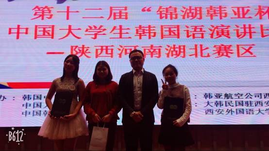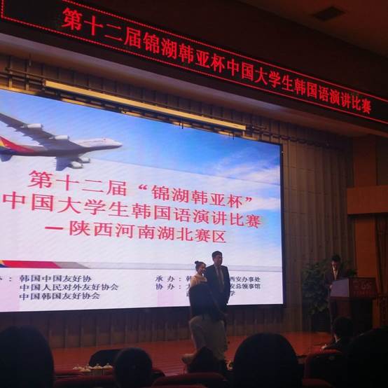 11月1日,第十二届“锦湖韩亚杯”中国大学生韩国语演讲比赛陕西湖北河南赛区在西安外国语大学举行。我院2014级韩国语专业的学生凌珊同学在韩龙浩老师的带领下参加此比赛获得了该赛区总冠军,并将继续代表湖北陕西河南赛区出站全国总决赛。本次比赛共有湖北、陕西、河南3省8所高校的韩国语专业的选手参赛。西安外国语大学副校长姜亚军、韩国驻西安总领事馆领事吴世天、韩国旅游发展局西安办事处副会长全镕赞、大韩贸易投资振兴公社西安代表处馆长李观珪以及参赛高校的指导老师参加了本次大赛。