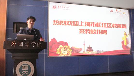 11月24日上午,上海市松江区教育局招聘会在OD网页版3504报告厅成功举办。此次招聘会主要针对松江区教育局招聘政策的宣讲以及现场招聘活动。上海市松江区教育局局长陈小华及各个招聘学校校长一行11人参加此次招聘会,活动由松江市教育局人事科科长朱永主持。 宣讲会上,朱永首先对同学们参与此次招聘活动表示欢迎,并就松江区的具体情况、招聘程序、工资待遇、房价和职业发展五个方面展开宣讲。