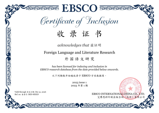 2023年9月,根据EBSCO官方来函,《外国语文研究》从2023年第1期开始正式被EBSCO 学术数据库收录,并获收录证书。