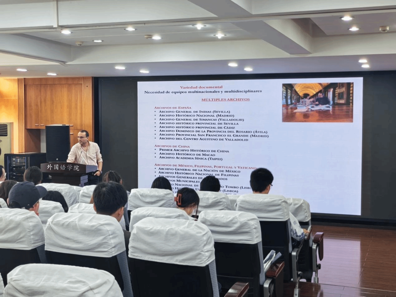 第二场讲座题为“用于研究明代中国与西班牙经济关系的西班牙档案和文献类型:一种文献学和古文书学”。欧荷西首先指出,掌握古西班牙语、阅读西班牙语古文书档案,对于研究中西关系史乃至中国历史都非常重要。他结合个人研究经历,介绍了包含明朝时期中西两国商贸和外交往来信息的多个西班牙语档案,分享了研究和运用这些史料的方法和原则。他还梳理了西班牙语书写体的演变历程,展示了在马尼拉发现的迄今已知最早的中西文词典,强调其对当时的翻译交流以及后世语言学、历史学研究的重要意义。