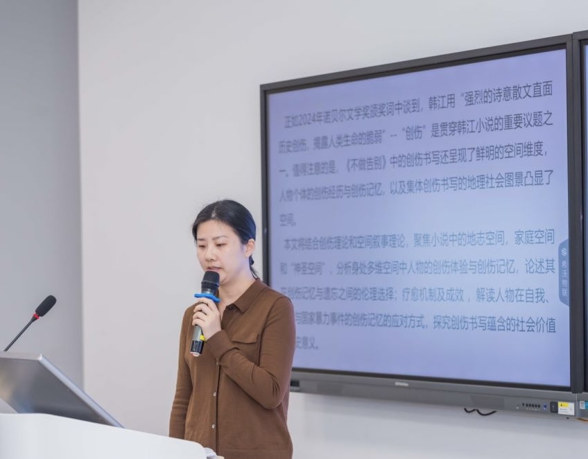 本届年会设了“近现代与当代文学”、“古代文学与东亚记行”、“文学接受与文化传播”、“文学比较、文学理论””四个分论坛,由七十多位老中青专家和学者分享了自己的最新研究成果。我院曾思齐老师参加了“近现代与当代文学”分论坛,宣读了题为“论韩江新作《不做告别》中的创伤书写”的论文。小说《不做告别》是2024年度诺贝尔文学奖获得者韩江的代表作之一,它通过个体对伤痛往事的追忆,勾画出七十多年前济州岛屠杀事件的集体创伤图景。曾思齐老师在这篇论文中通过分析《不做告别》中描述的屠杀事件对济州民众造成的肉体、精神创伤与心理创伤,探讨了作家韩江对特殊历史时期韩国民众的创伤体验与集体创伤记忆所进行的深邃思考。