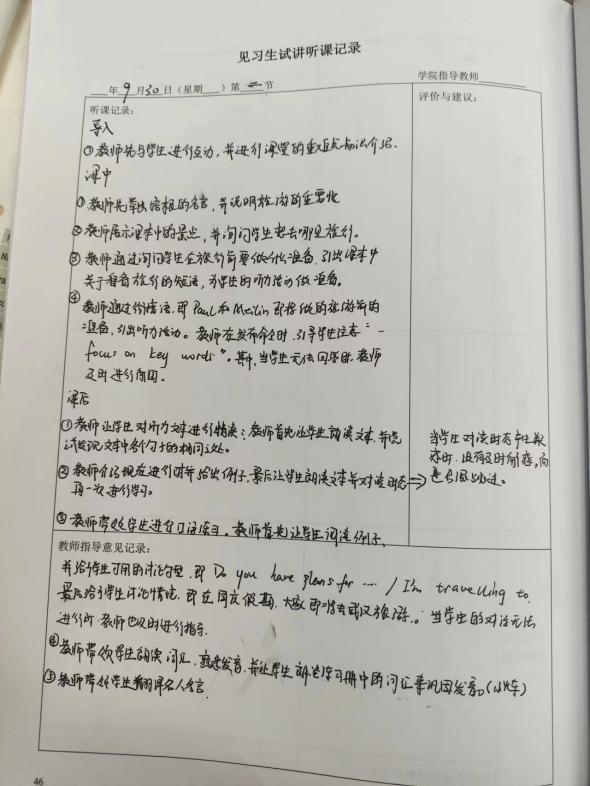 课后,我们实习生会对单元教学或者某一类型的课堂教学进行讨论,对比各自的教学记录和心得体会,为后续备课做好准备。